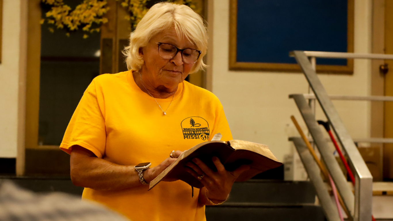North Carolina Baptists on Mission Chaplain Mischelle Camery leads a devotional before dinner. (Photo by Sharon Mager)