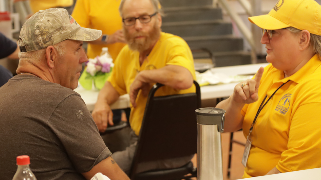 Fellowship is a huge part of the “Yellow Hat Army.” Kerry Wolford and Richard Perone enjoy a laugh together. (Photo by Sharon Mager)