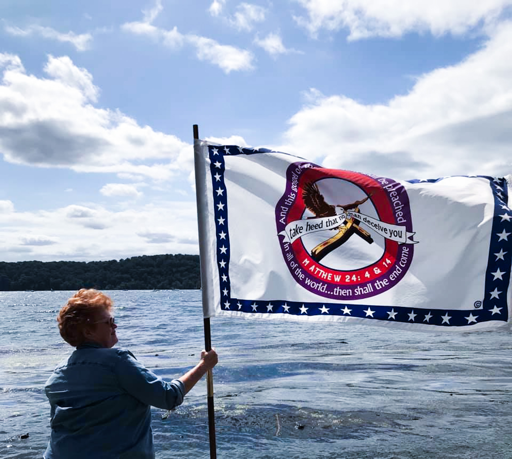 While sketching the flag design at home, she felt something was missing. A few Sundays later, while praying, she felt the Lord’s direction to pack her art supplies and travel 300 miles to Virginia Beach and did so the same day. The next day, while walking the grounds, she saw the inscription over the Broadcast studio doors and felt the Holy Spirit leading her to use that scripture, Matthew 24:14, “And this gospel of the kingdom shall be preached in all of the world…then shall the end come,“ which she incorporated into the design. She was also led to include Matthew 24:4, “…Take heed that no man deceive you.”
